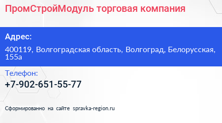 ПромСтройМодуль, торговая компания по адресу 400119, Волгоградская область, Волгоград, Белорусская, 155а в дальнейшем Организация, размещена в следующих категориях: