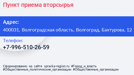Пункт приема вторсырья по адресу 400031, Волгоградская область, Волгоград, Бахтурова, 12 в дальнейшем Организация, размещена в следующих категориях: