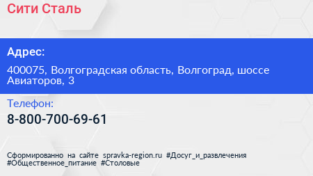 Сити-Сталь по адресу 400075, Волгоградская область, Волгоград, шоссе Авиаторов, 3 в дальнейшем Организация, размещена в следующих категориях:
