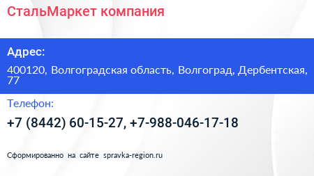 СтальМаркет, компания по адресу 400120, Волгоградская область, Волгоград, Дербентская, 77 в дальнейшем Организация, размещена в следующих категориях: