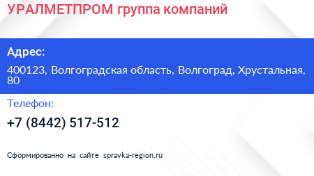 УРАЛМЕТПРОМ, группа компаний по адресу 400123, Волгоградская область, Волгоград, Хрустальная, 80 в дальнейшем Организация, размещена в следующих категориях: