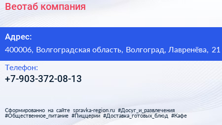 Веотаб, компания по адресу 400006, Волгоградская область, Волгоград, Лавренёва, 21 в дальнейшем Организация, размещена в следующих категориях:
