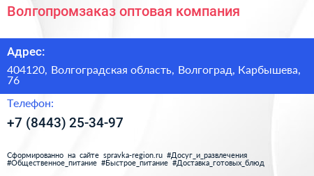 Волгопромзаказ, оптовая компания по адресу 404120, Волгоградская область, Волгоград, Карбышева, 76 в дальнейшем Организация, размещена в следующих категориях: