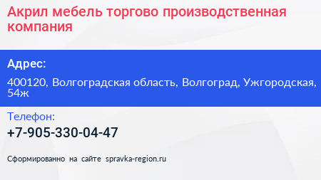 Акрил-мебель, торгово-производственная компания по адресу 400120, Волгоградская область, Волгоград, Ужгородская, 54ж в дальнейшем Организация, размещена в следующих категориях: