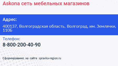 Askona, сеть мебельных магазинов по адресу 400137, Волгоградская область, Волгоград, им. Землячки, 110Б в дальнейшем Организация, размещена в следующих категориях: