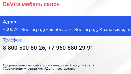 DaVita-мебель, салон по адресу 400074, Волгоградская область, Волгоград, Козловская, 55 в дальнейшем Организация, размещена в следующих категориях: