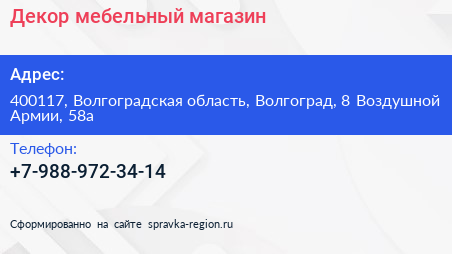 Декор, мебельный магазин по адресу 400117, Волгоградская область, Волгоград, 8 Воздушной Армии, 58а в дальнейшем Организация, размещена в следующих категориях: