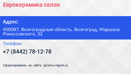 Еврокерамика, салон по адресу 400087, Волгоградская область, Волгоград, Маршала Рокоссовского, 32 в дальнейшем Организация, размещена в следующих категориях: