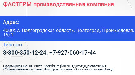 ФАСТЕРМ, производственная компания по адресу 400057, Волгоградская область, Волгоград, Промысловая, 15/1 в дальнейшем Организация, размещена в следующих категориях: