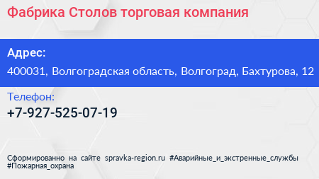 Фабрика Столов, торговая компания по адресу 400031, Волгоградская область, Волгоград, Бахтурова, 12 в дальнейшем Организация, размещена в следующих категориях: