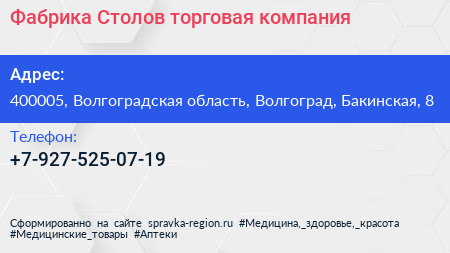 Фабрика Столов, торговая компания по адресу 400005, Волгоградская область, Волгоград, Бакинская, 8 в дальнейшем Организация, размещена в следующих категориях: