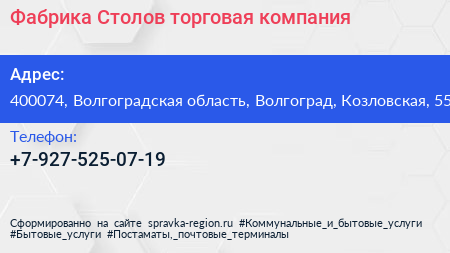 Фабрика Столов, торговая компания по адресу 400074, Волгоградская область, Волгоград, Козловская, 55 в дальнейшем Организация, размещена в следующих категориях: