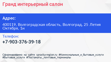 Гранд, интерьерный салон по адресу 400119, Волгоградская область, Волгоград, 25 Летия Октября, 1н в дальнейшем Организация, размещена в следующих категориях: