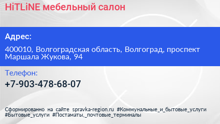HiTLiNE, мебельный салон по адресу 400010, Волгоградская область, Волгоград, проспект Маршала Жукова, 94 в дальнейшем Организация, размещена в следующих категориях: