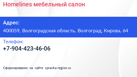 Homelines, мебельный салон по адресу 400059, Волгоградская область, Волгоград, Кирова, 64 в дальнейшем Организация, размещена в следующих категориях: