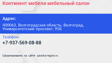 Континент мебели, мебельный салон по адресу 400062, Волгоградская область, Волгоград, Университетский проспект, 95Б в дальнейшем Организация, размещена в следующих категориях: