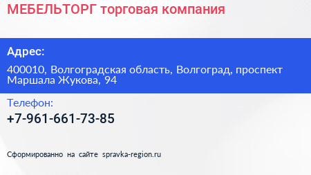 МЕБЕЛЬТОРГ, торговая компания по адресу 400010, Волгоградская область, Волгоград, проспект Маршала Жукова, 94 в дальнейшем Организация, размещена в следующих категориях:
