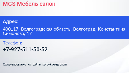 MGS Мебель, салон по адресу 400117, Волгоградская область, Волгоград, Константина Симонова, 17 в дальнейшем Организация, размещена в следующих категориях: