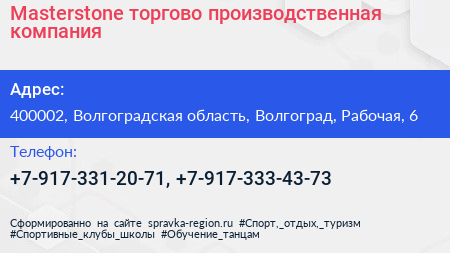 Masterstone, торгово-производственная компания по адресу 400002, Волгоградская область, Волгоград, Рабочая, 6 в дальнейшем Организация, размещена в следующих категориях: