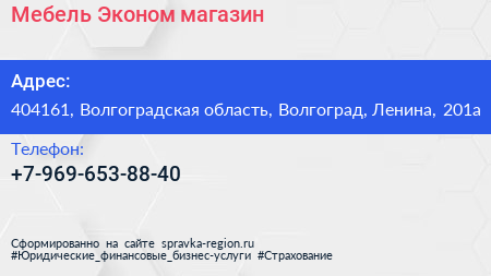 Мебель-Эконом, магазин по адресу 404161, Волгоградская область, Волгоград, Ленина, 201а в дальнейшем Организация, размещена в следующих категориях: