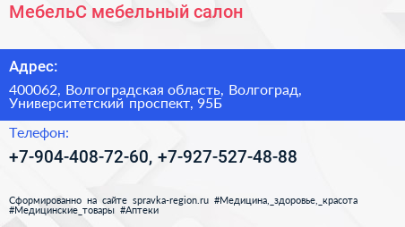 МебельС, мебельный салон по адресу 400062, Волгоградская область, Волгоград, Университетский проспект, 95Б в дальнейшем Организация, размещена в следующих категориях: