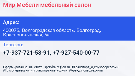 Мир Мебели, мебельный салон по адресу 400075, Волгоградская область, Волгоград, Краснополянская, 5а в дальнейшем Организация, размещена в следующих категориях: