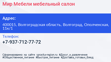 Мир Мебели, мебельный салон по адресу 400015, Волгоградская область, Волгоград, Ополченская, 11к/1 в дальнейшем Организация, размещена в следующих категориях: