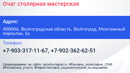 Очаг, столярная мастерская по адресу 400046, Волгоградская область, Волгоград, Монтажный переулок, 1а в дальнейшем Организация, размещена в следующих категориях: