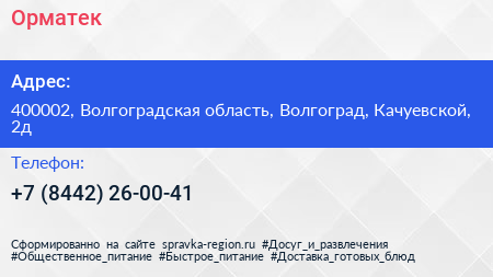 Орматек по адресу 400002, Волгоградская область, Волгоград, Качуевской, 2д в дальнейшем Организация, размещена в следующих категориях:
