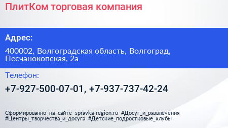 ПлитКом, торговая компания по адресу 400002, Волгоградская область, Волгоград, Песчанокопская, 2а в дальнейшем Организация, размещена в следующих категориях: