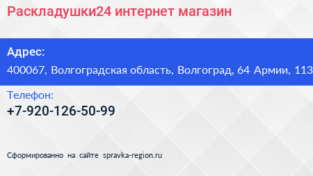 Раскладушки24, интернет-магазин по адресу 400067, Волгоградская область, Волгоград, 64 Армии, 113 в дальнейшем Организация, размещена в следующих категориях: