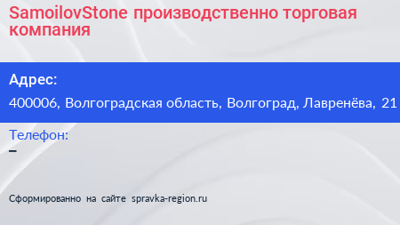 SamoilovStone, производственно-торговая компания по адресу 400006, Волгоградская область, Волгоград, Лавренёва, 21 в дальнейшем Организация, размещена в следующих категориях: