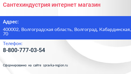Сантехиндустрия, интернет-магазин по адресу 400002, Волгоградская область, Волгоград, Кабардинская, 70 в дальнейшем Организация, размещена в следующих категориях: