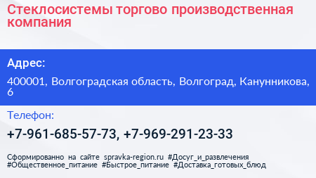 Стеклосистемы, торгово-производственная компания по адресу 400001, Волгоградская область, Волгоград, Канунникова, 6 в дальнейшем Организация, размещена в следующих категориях:
