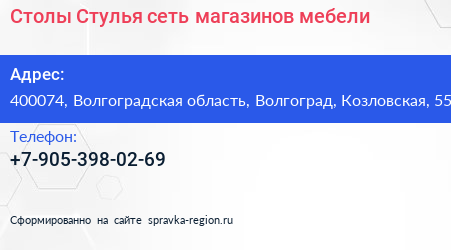 Столы Стулья, сеть магазинов мебели по адресу 400074, Волгоградская область, Волгоград, Козловская, 55 в дальнейшем Организация, размещена в следующих категориях: