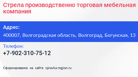 Стрела, производственно-торговая мебельная компания по адресу 400007, Волгоградская область, Волгоград, Богунская, 13 в дальнейшем Организация, размещена в следующих категориях: