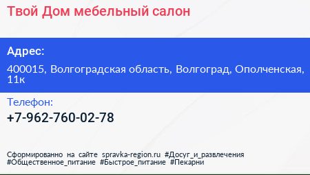 Твой Дом, мебельный салон по адресу 400015, Волгоградская область, Волгоград, Ополченская, 11к в дальнейшем Организация, размещена в следующих категориях: