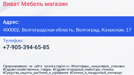 Виват Мебель, магазин по адресу 400002, Волгоградская область, Волгоград, Казахская, 17 в дальнейшем Организация, размещена в следующих категориях:
