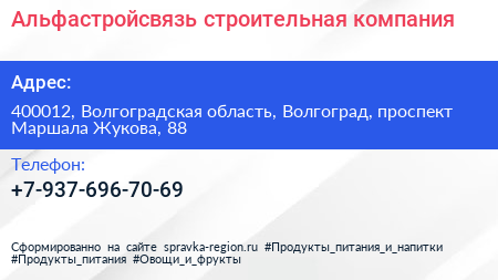 Альфастройсвязь, строительная компания по адресу 400012, Волгоградская область, Волгоград, проспект Маршала Жукова, 88 в дальнейшем Организация, размещена в следующих категориях: