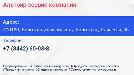Альтоир-сервис, компания по адресу 400120, Волгоградская область, Волгоград, Елисеева, 38 в дальнейшем Организация, размещена в следующих категориях:
