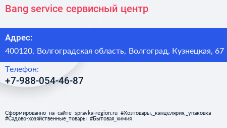 Bang service, сервисный центр по адресу 400120, Волгоградская область, Волгоград, Кузнецкая, 67 в дальнейшем Организация, размещена в следующих категориях: