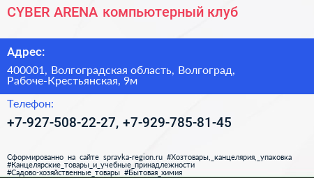 CYBER ARENA, компьютерный клуб по адресу 400001, Волгоградская область, Волгоград, Рабоче-Крестьянская, 9м в дальнейшем Организация, размещена в следующих категориях: