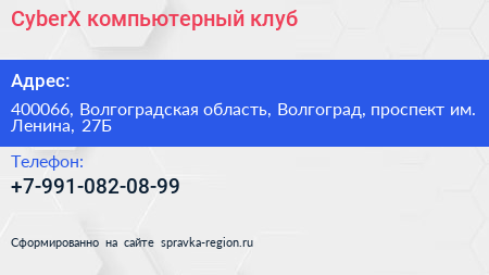 CyberX, компьютерный клуб по адресу 400066, Волгоградская область, Волгоград, проспект им. Ленина, 27Б в дальнейшем Организация, размещена в следующих категориях: