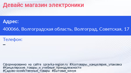 Девайс, магазин электроники по адресу 400066, Волгоградская область, Волгоград, Советская, 17 в дальнейшем Организация, размещена в следующих категориях: