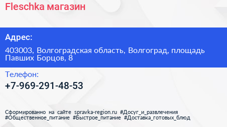 Fleschka, магазин по адресу 403003, Волгоградская область, Волгоград, площадь Павших Борцов, 8 в дальнейшем Организация, размещена в следующих категориях: