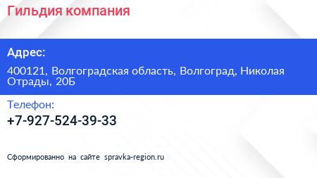 Гильдия, компания по адресу 400121, Волгоградская область, Волгоград, Николая Отрады, 20Б в дальнейшем Организация, размещена в следующих категориях: