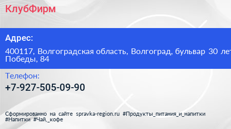 КлубФирм по адресу 400117, Волгоградская область, Волгоград, бульвар 30 лет Победы, 84 в дальнейшем Организация, размещена в следующих категориях: