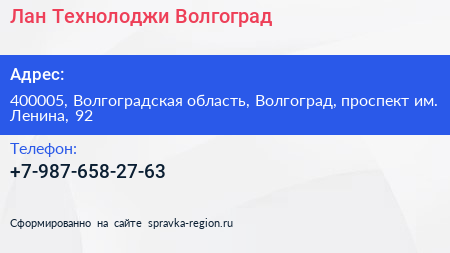 Лан Технолоджи Волгоград по адресу 400005, Волгоградская область, Волгоград, проспект им. Ленина, 92 в дальнейшем Организация, размещена в следующих категориях: