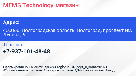 MEMS Technology, магазин по адресу 400066, Волгоградская область, Волгоград, проспект им. Ленина, 5 в дальнейшем Организация, размещена в следующих категориях: