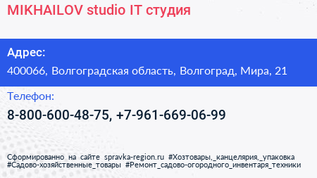 MIKHAILOV studio, IT-студия по адресу 400066, Волгоградская область, Волгоград, Мира, 21 в дальнейшем Организация, размещена в следующих категориях: